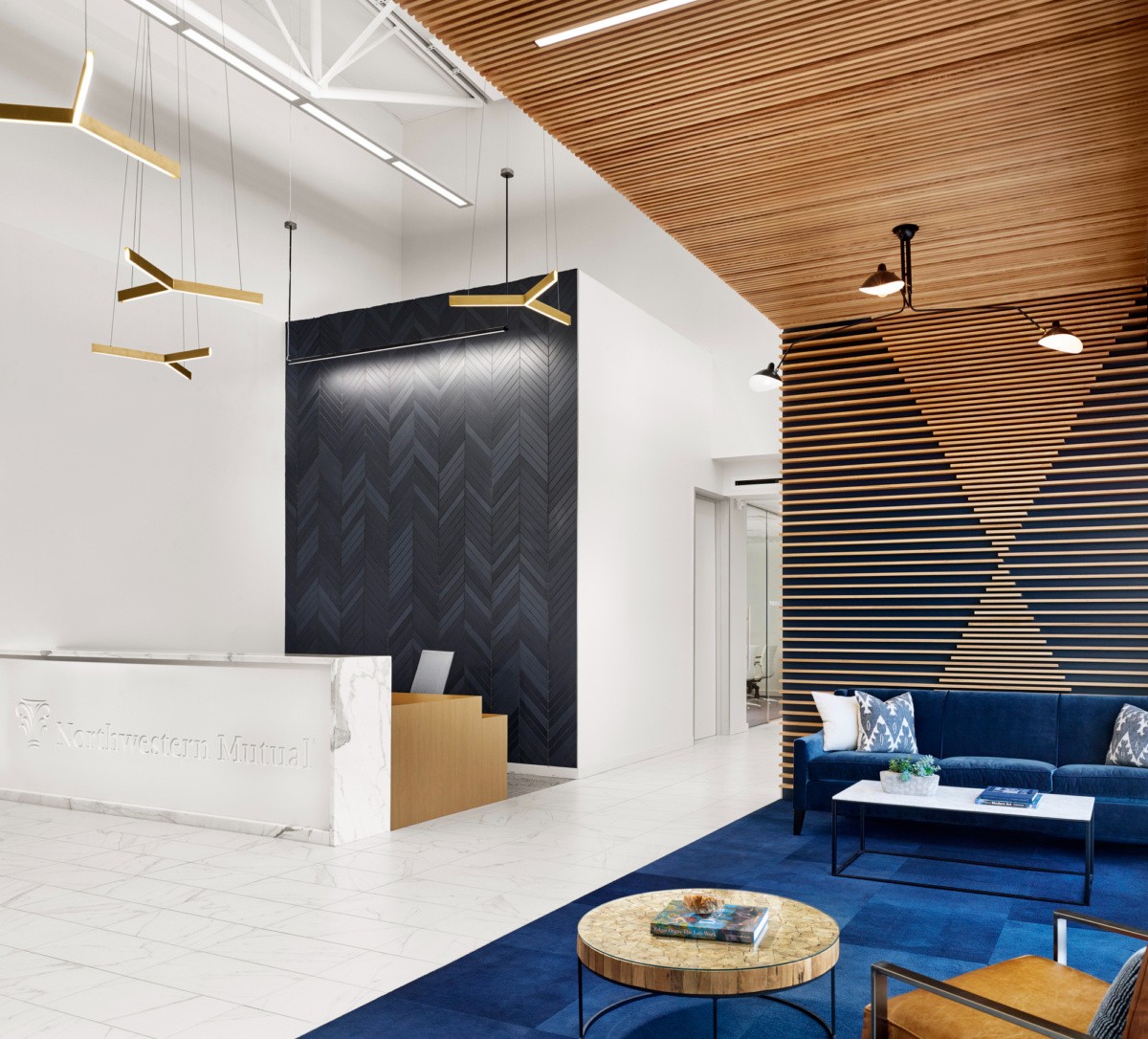新西兰制造的标志性灯具反映了宽敞的高天花板,突出了高度,并增添了一丝金色的趣味。精致的大理石外观瓷砖与现代哑光灰色V形瓷砖相结合,融合了设计团队的理念。深邃、郁郁葱葱的蓝色和海军蓝色调为大厅带来了对比和戏剧性,同时也向公司品牌致敬。#办公室装修设计#